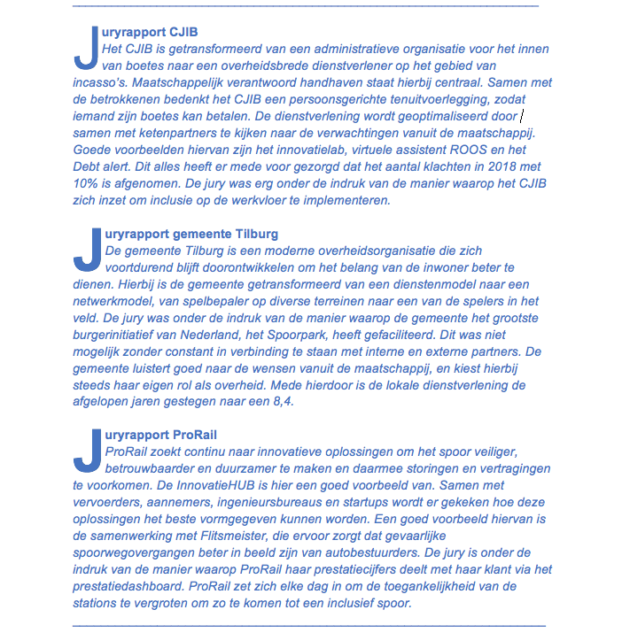 De finalisten van de Verkiezing Beste Overheidsorganisatie van het Jaar voor 2019 zijn bekend. Uit tien kandidaten heeft de jury gekozen voor: Centraal Justitieel Incasso Bureau, gemeente Tilburg en ProRail. Deze organisaties gaan met elkaar de strijd aan in de finale, die op 19 november aanstaande wordt gehouden in de Ridderzaal. Op 9, 16 en 30 oktober ontvangen de finalisten een delegatie van de jury tijdens een werkbezoek. Tijdens het werkbezoek krijgen de finalisten de kans om de jury ervan te overtuigen dat hun organisatie ‘de beste’ is.
