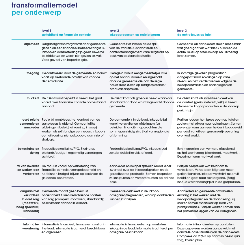Veel gemeenten en ook zorgaanbieders worstelen met de inkoop van zorg (Jeugd en Wmo). Om hen te helpen hebben Frank Bosboom, Leon Klinkers en Ruut van Andel vanuit hun ervaring met het sociaal domein een model ontwikkeld, dat lerend werkt en helpt om bewuster met inkoopprocessen om te gaan. Het is een handreiking waarmee gemeenten vast kunnen stellen: waar staan wij en wat typeert ons? En om de vraag te stellen: zijn we daar tevreden mee? Zo kunnen zij hun gemaakte (beleids-)keuzes en praktijk spiegelen aan andere gemeenten en hiervan leren.