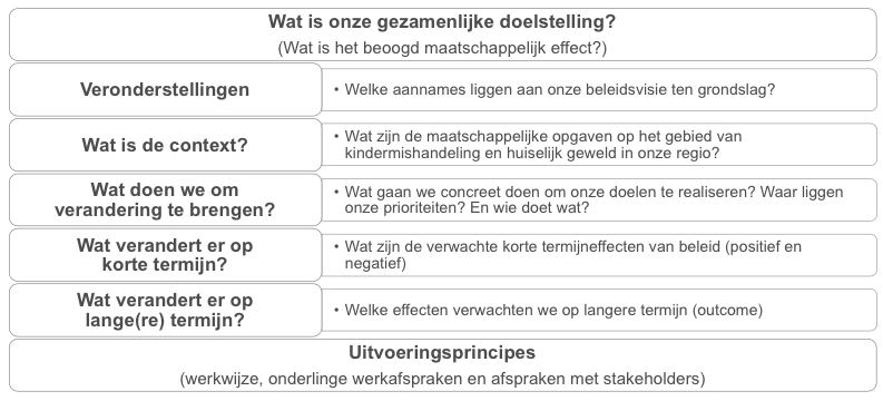 Een succesvolle aanpak van de complexe opgaven rond kindermishandeling en huiselijk geweld vraagt om partnership tussen de gemeenten gezamenlijk en VT als uitvoerende organisatie. Gezamenlijk hebben zij de verantwoordelijkheid om te komen tot een krachtige en snelle aanpak in thuissituaties waarin acuut gevaar dreigt. Dit veronderstelt een gezamenlijk beeld over de maatschappelijke opgave en aanpak (‘theory of change’). VT is hierin een essentiële schakel, maar ook partners als de sociale wijkteams en de politie zijn cruciaal. Dat betekent dat de betrokken partijen gezamenlijk kleur moeten bekennen op de positionering van VT in de zorg- en veiligheidsketen. Vanuit de collectieve opgaven als startpunt voor dit gesprek naar duidelijkheid over de taak van VT in de totale keten. Hieronder benoemen we daarvoor een aantal bouwstenen.