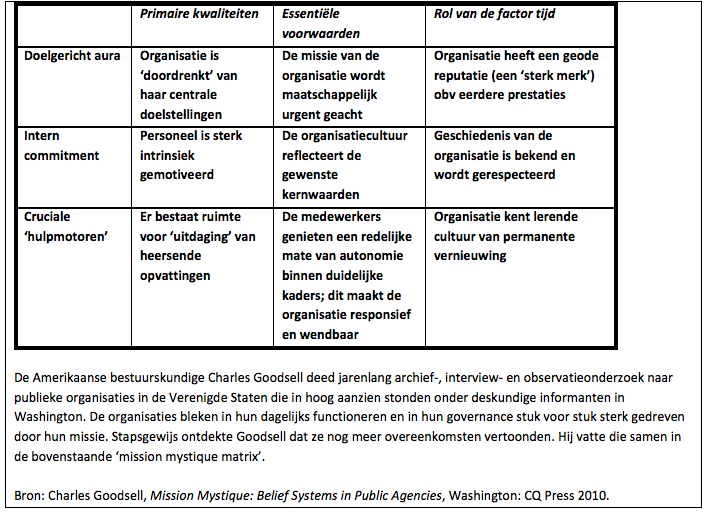 Uiteindelijk bleken er dus wel degelijk frappante overeenkomsten te bestaan tussen de idealen en praktijken van deze succesvolle Nederlandse overheidsorganisaties en de kenmerken van hun Amerikaanse equivalenten die Goodsell in zijn matrix heeft proberen te vangen. Opvallend is de nadruk die wordt gelegd op ‘klassieke’ (rechtmatigheid) en ‘zachte factoren’ (waarden, geschiedenis, ruimte, leervermogen). Opvallende afwezigen in het gesprek en in de matrix van Goodsell: de ‘harde’ factoren (prestatiemeting, prestatiecontracten, concurrentie via marktwerking) die de kern van het gedachtengoed van het ‘new public management’ vormden. Teken des tijds? In ieder geval stof tot nadenken voor al diegenen in het publieke domein die juist daarin zo zwaar investeren.