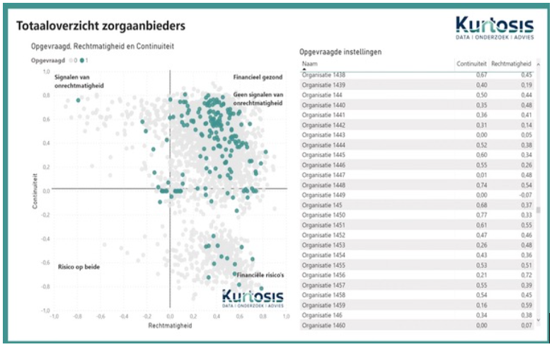 Deze analyse is ook mogelijk per gemeente en per inkoopregio. Tevens kun je in het online dashboard elke stip op de kaart aanklikken om te kijken om welke organisatie het gaat en wat de onderliggende scores zijn. De analyse vormt geen bewijs, maar heeft wel een signaalfunctie.