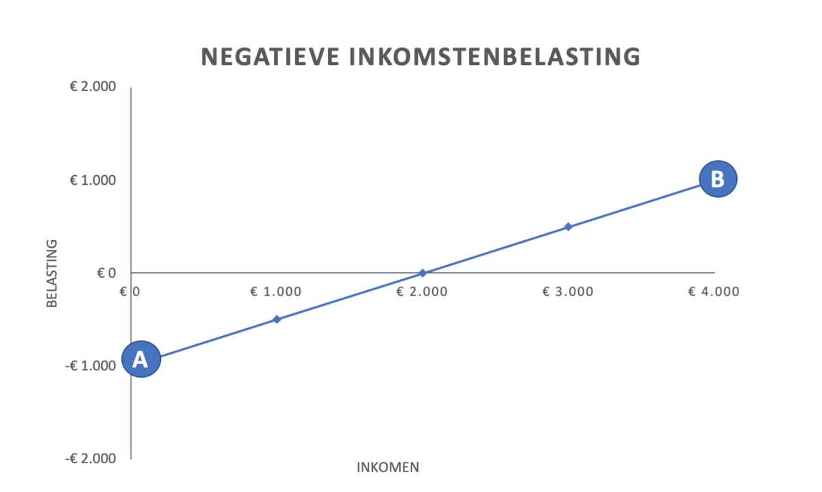 In bovenstaande grafiek ontvangt (A) bij een inkomen van nihil tóch een uitkering van 1.000 euro van de Belastingdienst. Bij een eigen inkomen van 2.000 euro betaalt hij, uitgaande van een vlaktaks van 50 procent, niets en ontvangt hij niets. (B) heeft een inkomen van 4.000 euro en betaalt per saldo 1.000 euro aan inkomstenbelasting.