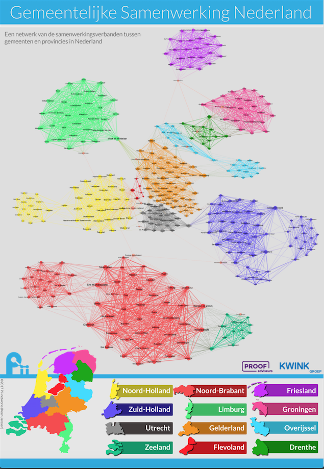 Deze talloze samenwerkingen tussen gemeenten zijn in de loop der jaren organisch ontstaan. Met behulp van een netwerkanalyse van Pii Networks konden we een kaart van samenwerking in Nederland maken (zie hiernaast). De bollen zijn gemeenten en provincies. De gemeenten zijn gekleurd op de provincie waar ze toe behoren, de provincies zijn roze. De lijnen zijn relaties tussen gemeenten. Als twee gemeenten onderdeel zijn van een samenwerkingsverband hebben ze een relatie.